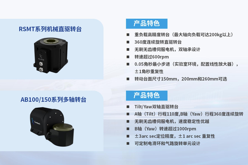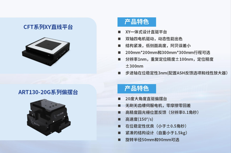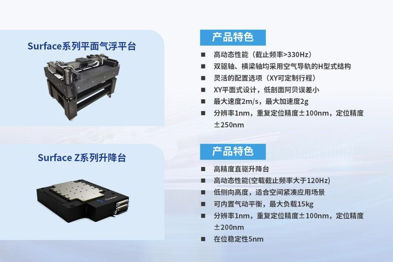 产品特点: ■ XY气浮平台叠加, ■ XY单轴直线度/平面度±0.5μm ■ XY 轴Pitch/Yaw/Roll <3 arcsec ■ XY重复性±0.1μm ■ Z轴双气缸配重,动态性能突出 更多光通信行业适用产品:
