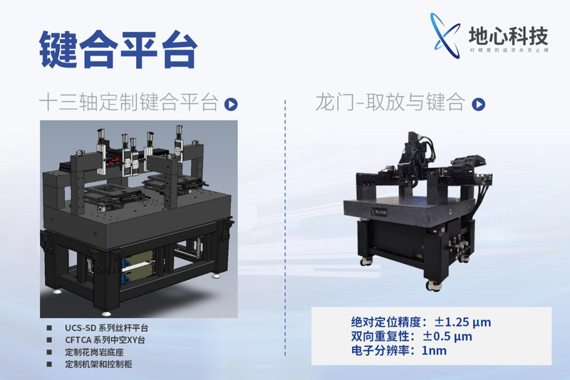 产品特点: ■ 基于高性能ART系列纳米平台集成 ■ 3~6个轴串联运动 ■ 所有轴非接触式直驱形式提升产能 ■ 直线轴最小步进为5 nm,转轴最小步进为0.05 arc sec ■ 多种配置和选项灵活搭配 ■ 配置工业标准能量计的模拟输入接口 3.定制晶圆键合