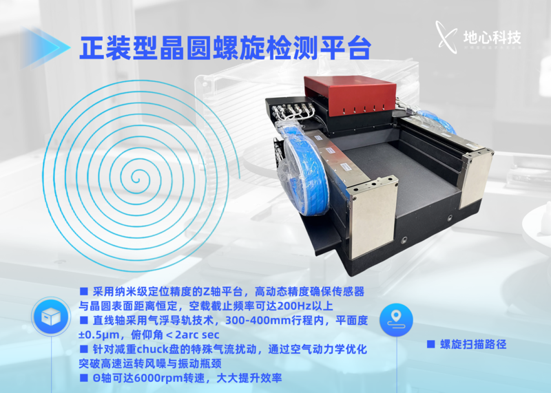 02 螺旋型晶圆缺陷检测 相较于传统的工字型扫描,螺旋型晶圆检测路径更适用于先进制程与高效率产线需求。螺旋运动特有的连续性路径特征,扫描路径可覆盖晶圆全域,单次扫描可完成检测,较传统“工”字运动减少约40%的机械移动时间。 无锡地心科技提供以超高转速气浮转台为核心的定制化螺旋检测方案,可以在实现直线轴及转台协同作业的条件下,使晶圆表面运动平面度<5μm;配合具备高动态响应能力的升降Z轴,可在高速运动过程中进行精准聚焦;转台携带chuck盘在6000rpm高速运动情况下,对直线轴的扰动可控制在±0.5μm以内,为更高分辨率、更小像元尺寸的图像传感器提供了稳定成像基础。